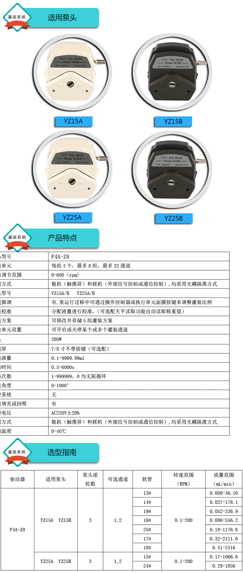 ? ? ?1.灌裝系統(tǒng)由4組基本通道(可擴展至32通道),一臺控制器組成,可安裝YZ15、YZ25泵頭