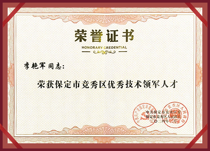 同時(shí),李艷軍先生也榮獲“保定市競秀區(qū)優(yōu)秀技術(shù)領(lǐng)軍人才”榮譽(yù)稱號(hào),并上臺(tái)領(lǐng)取了證書。這個(gè)榮譽(yù)是對(duì)他過去辛勤工作和取得成績的肯定,也是對(duì)他未來發(fā)展的鼓勵(lì)。他表示,這個(gè)榮譽(yù)將激勵(lì)他更加努力,在公司的發(fā)展中更加積極地貢獻(xiàn)自己的力量,為競秀區(qū)經(jīng)濟(jì)的進(jìn)一步發(fā)展作出更大的貢獻(xiàn),并由衷的感謝區(qū)領(lǐng)導(dǎo)的嘉獎(jiǎng)和認(rèn)可,并表示衷心感激!