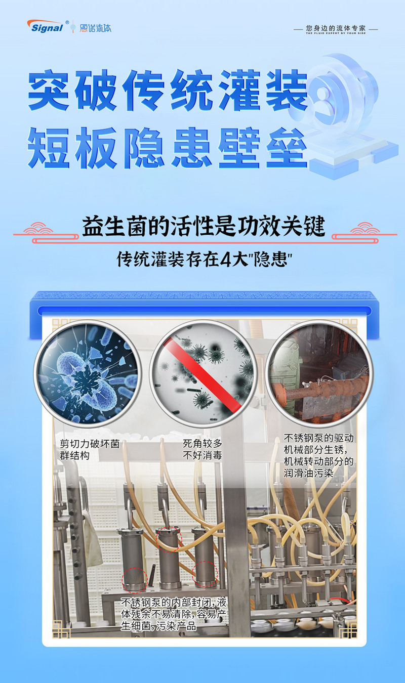 益生菌產品的核心價值在于其活性,然而傳統不銹鋼泵卻成了守護活性的“絆腳石”: