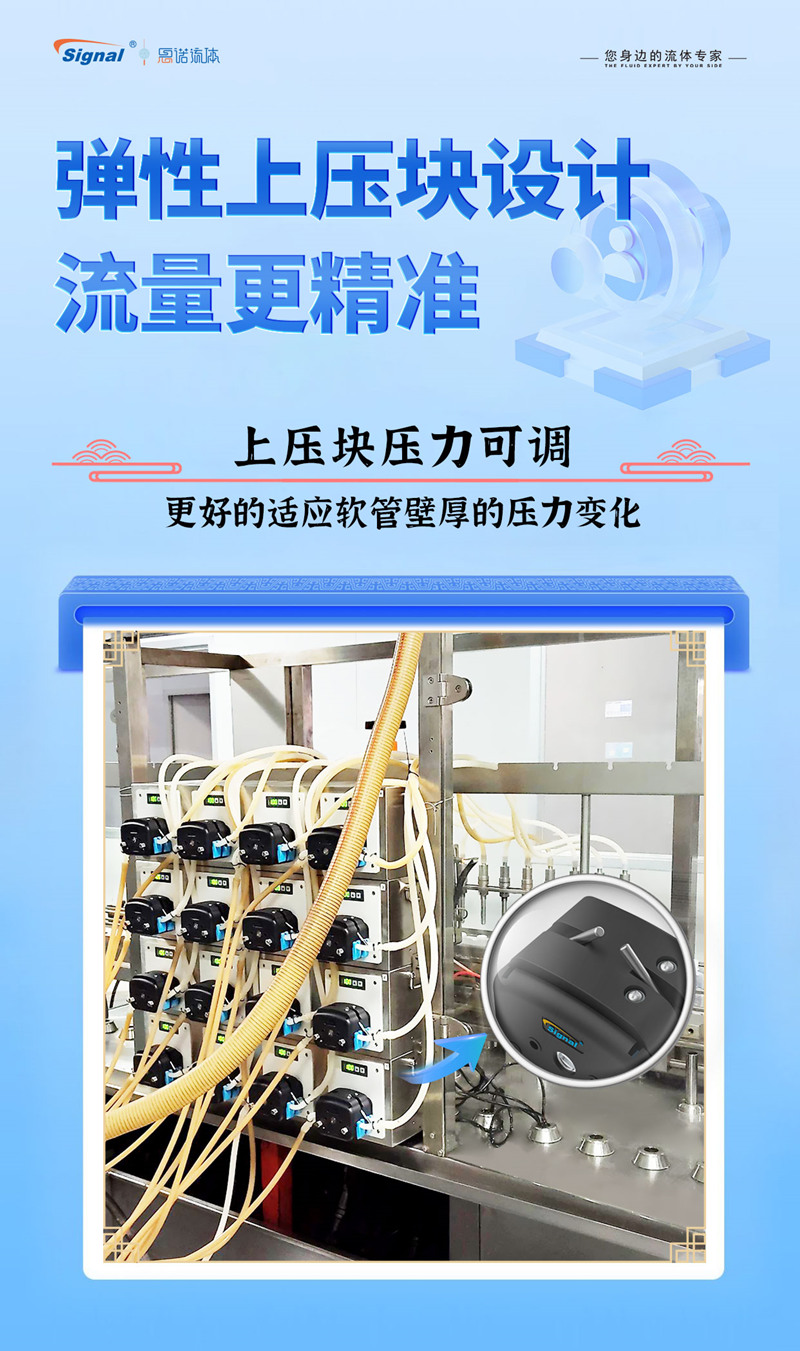 6. DMD15泵頭,彈性上壓塊設計,上壓塊壓力可調,更好的適應軟管壁厚變化的壓力變化,讓流量更精準,同時延長軟管使用壽命。