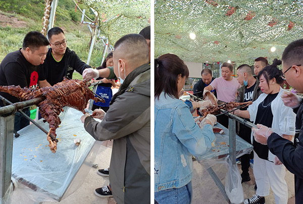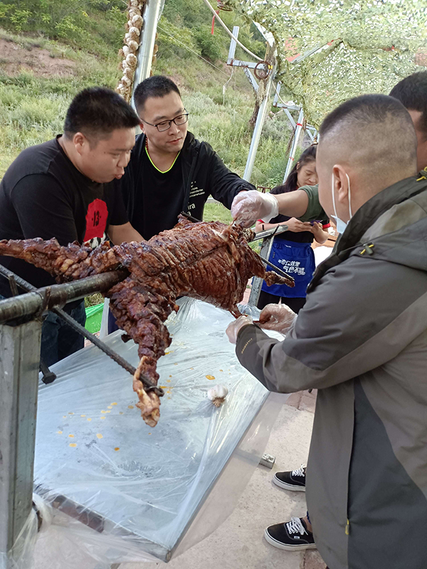 一天的行程,大家在歡聲笑語中結束了。大家的肚子也咕咕叫了,別著急還有更精彩的,公司還為大家準備了正宗烤全羊。大家一起舉杯祝愿公司發展越來越好,再創佳績!