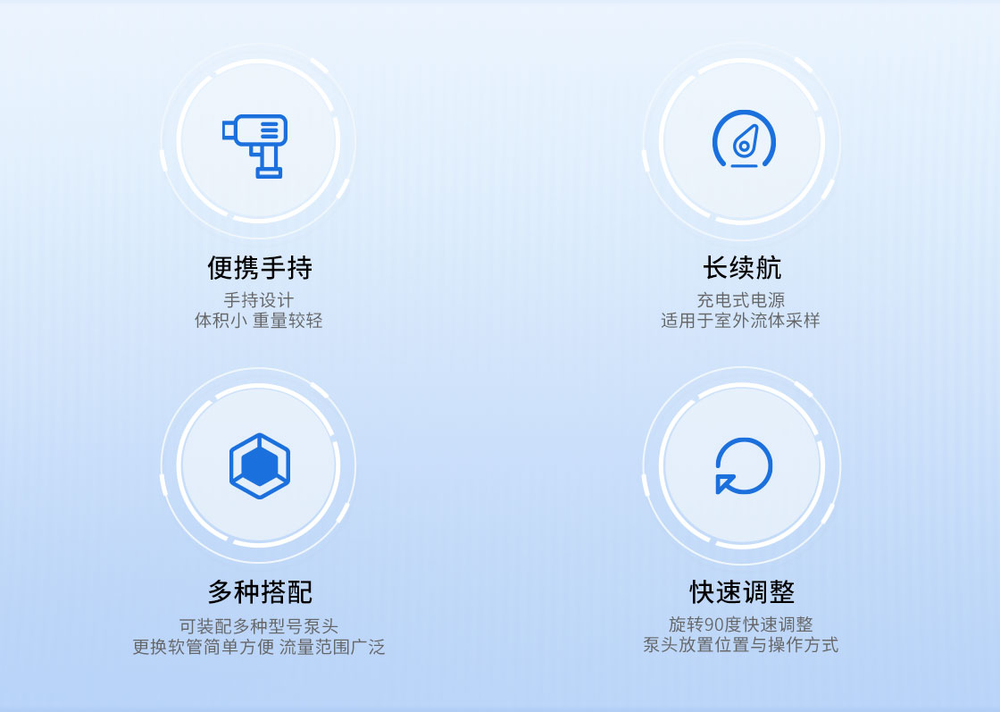 ●可裝配YZ15、YZ25、BZ15-14、BZ15-16、BZ25與KZ25等六種型號泵頭,適配多種規格軟管,流量范圍大,可靈活采樣。