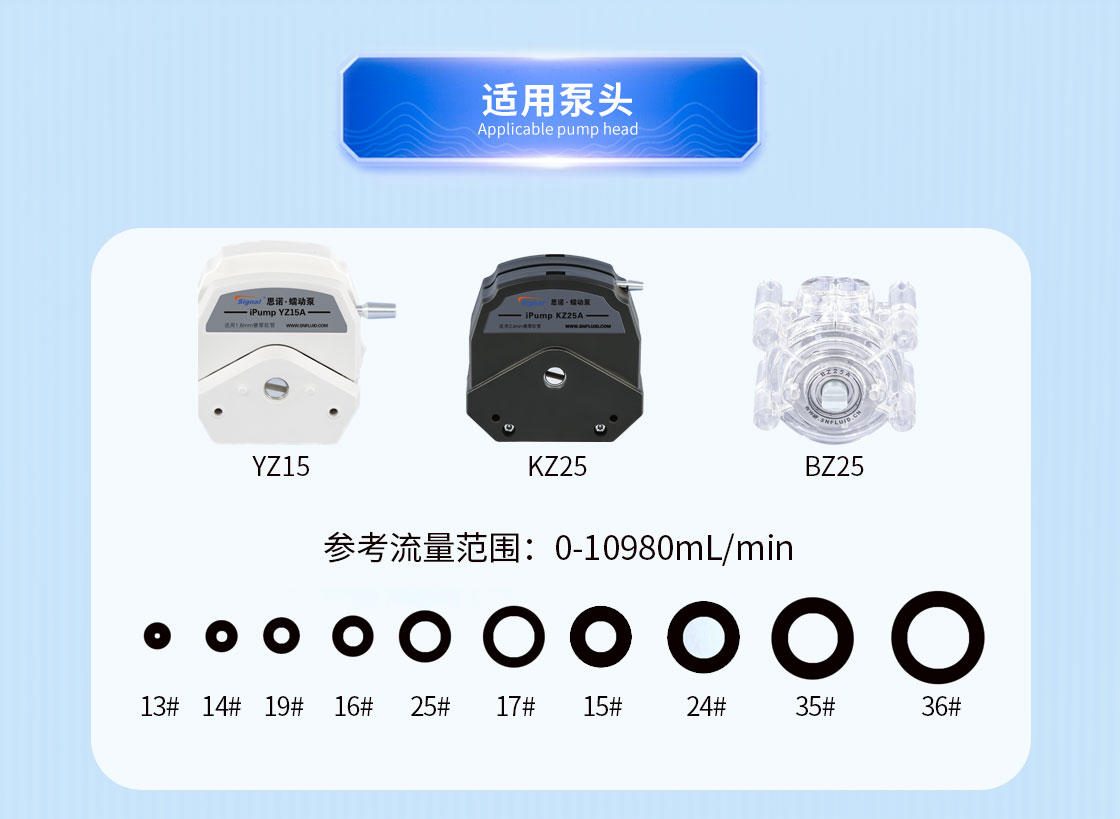 ●可裝配多種型號泵頭,更換軟管簡單方便,流量范圍廣泛。