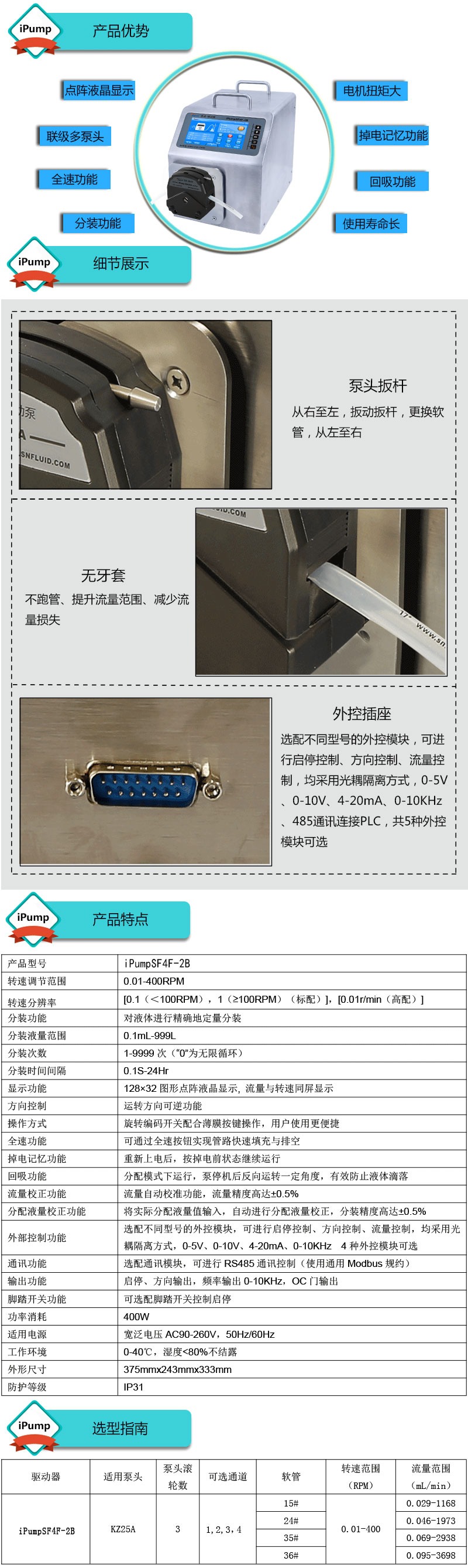 1.流量范圍:0.029-3698mL/min 2.兩種工作模式,流量模式與分配模式可選 3.具有流量校正、分裝液量校正功能 4.分裝精度高達(dá)±0.4%以內(nèi) 5.采用伺服電機驅(qū)動,控制準(zhǔn),動力強勁 6.線路板全部三防漆處理,防腐、防潮