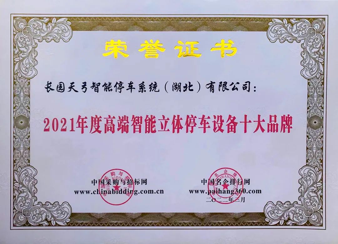 榮獲“2021年度政府采購立體停車設備十大品牌”、“2021年度立體停車設備十大質量放心企業”、“2021年度高端智能立體停車設備十大品牌”、“2021年度城市公共停車場(樓)項目立體停車設備前五強”、“2021年度智慧停車技術十大創新標桿企業”等五項殊榮。
