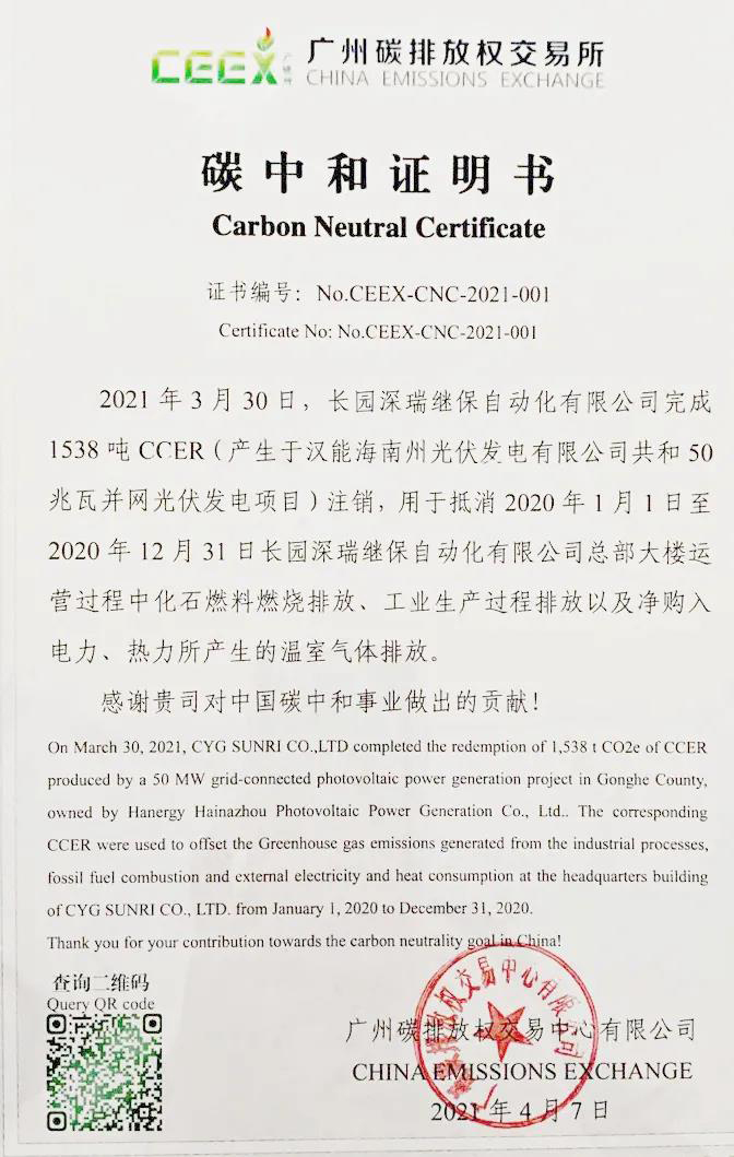 在首次“零碳鑒定”后,長(zhǎng)園深瑞開(kāi)始著手啟動(dòng)本部大樓碳中和項(xiàng)目,并積極中和本部大樓2020年運(yùn)營(yíng)過(guò)程中化石燃料燃燒排放、工業(yè)生產(chǎn)過(guò)程排放以及凈購(gòu)入電力、熱力所產(chǎn)生的1538噸溫室氣體排放,實(shí)現(xiàn)公司運(yùn)營(yíng)層面零碳目標(biāo)。